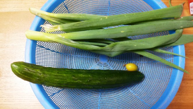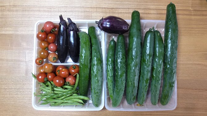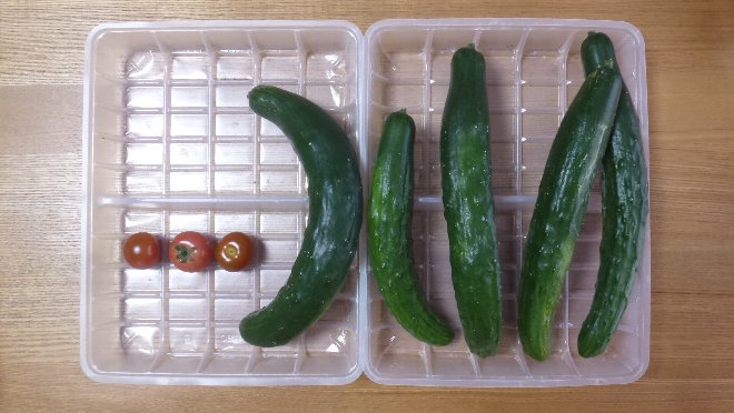 キュウリは11本採れたが中4日でおおきくなりすぎが多い。