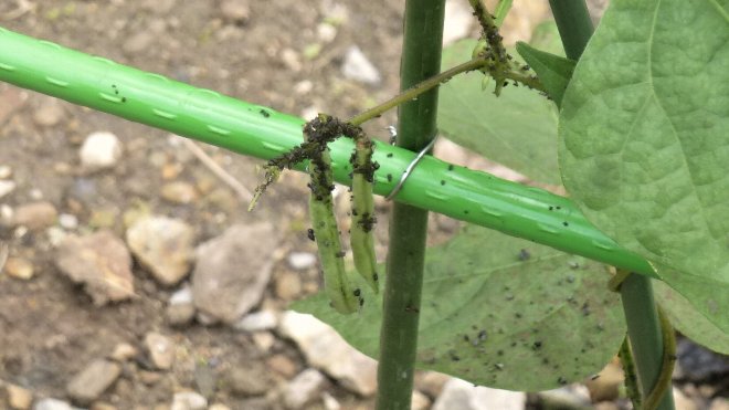 アブラムシがびっしり付いていたインゲンは消毒してきれいになった。