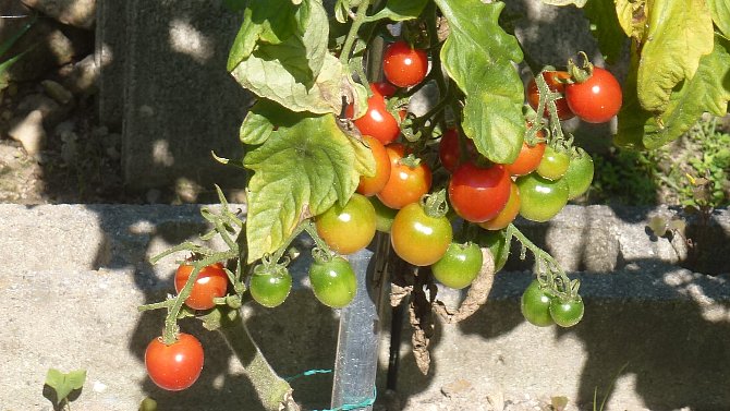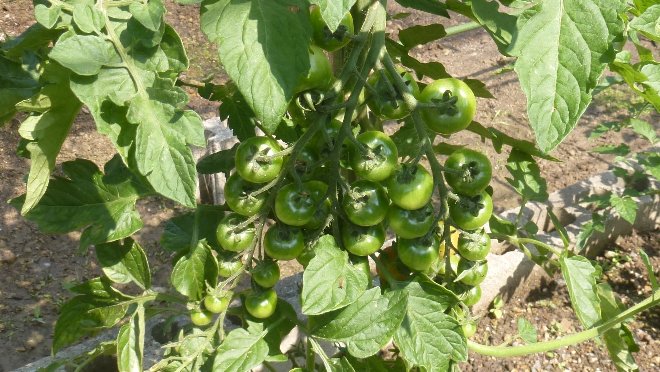 ミニトマトはまだ青いのが多いが鈴なりに実が付いていて、一斉に色づく
