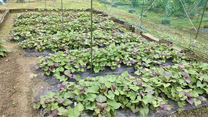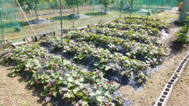 サツマイモ(安納芋)の葉は元気に伸びているが雑草も増えてきた。