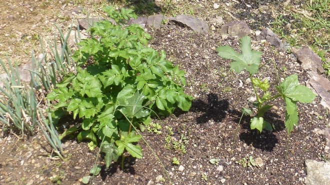 ジャガイモのあとに挿し木したミニトマトも根付いたようで立っている。