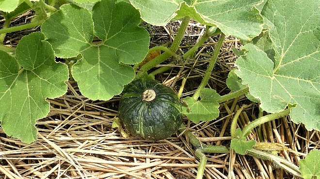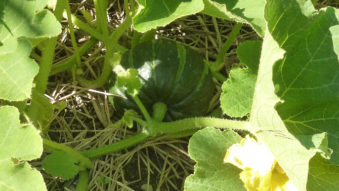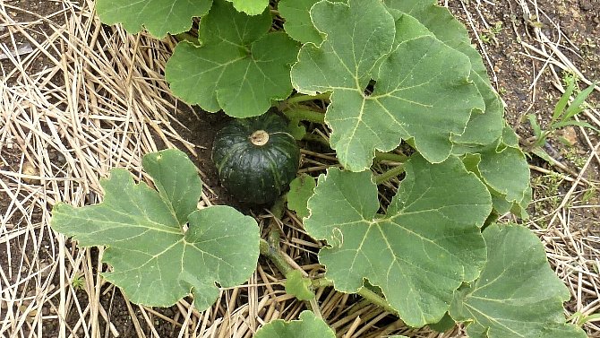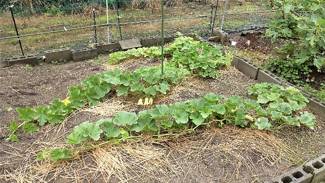 坊ちゃんカボチャのツルが伸びだし一番長いツルには4個の玉ができ、