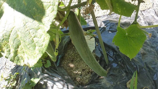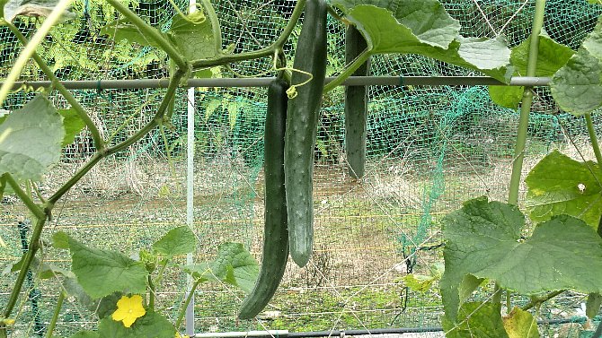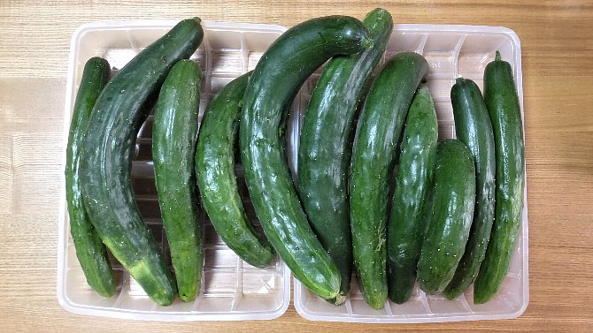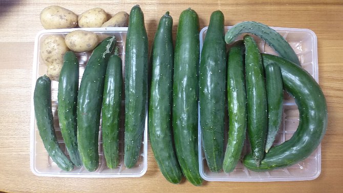 キュウリは中3日で8本収穫したうちの5本は巨大になりウリのよう。