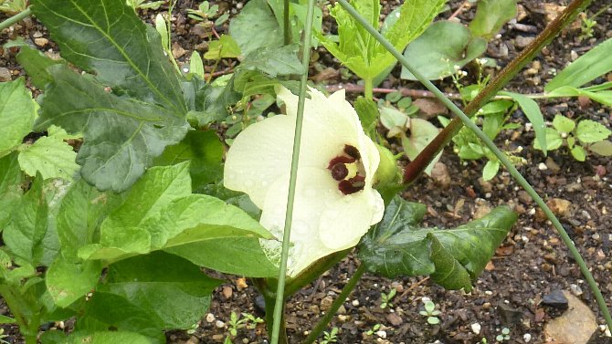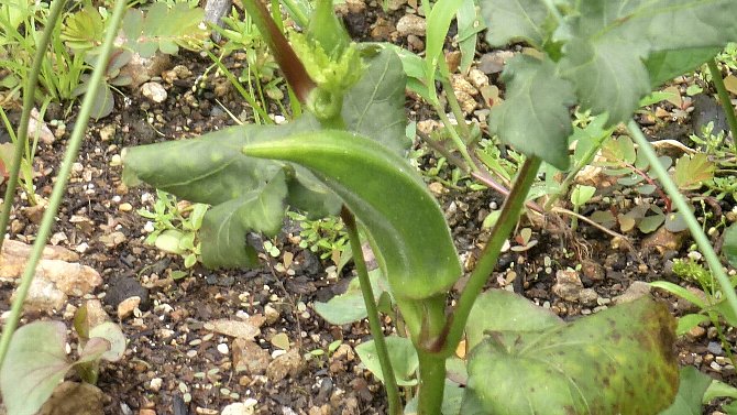 2本植えてあるオクラはまだ小さいが1本ずつ実を付けたが、固くて