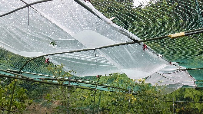 設置後、すぐに大雨強風でカバーはめくれ大きく育ってきたトマトも倒れてしまった。