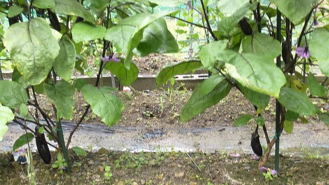 ナスビ、水ナスは伸びだしたがまだ実にはなっていない。