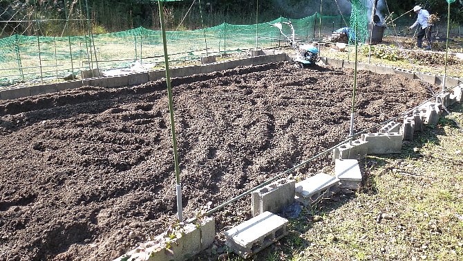 牛糞を入れておいた畑の畝つくりのため耕運機で攪拌し10メートル