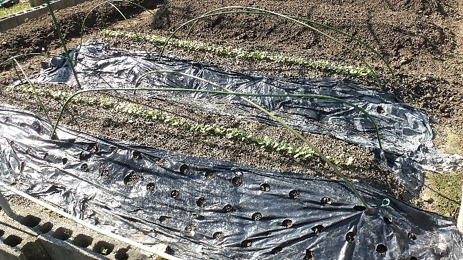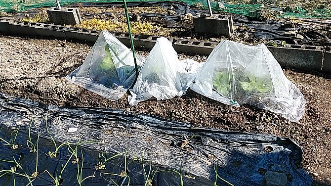 防寒対策のため冬野菜のホウレンソウ、ブロッコリー。ニンジンに不織布