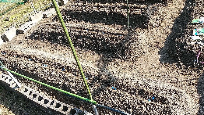 久しぶりに全体を耕運機にかけ畝を作り直した南側の畑は、この畝の形で