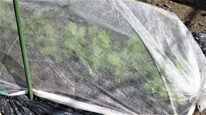 密集していたダイコンの芽を剪定してから、防寒用の不織布を被せた。