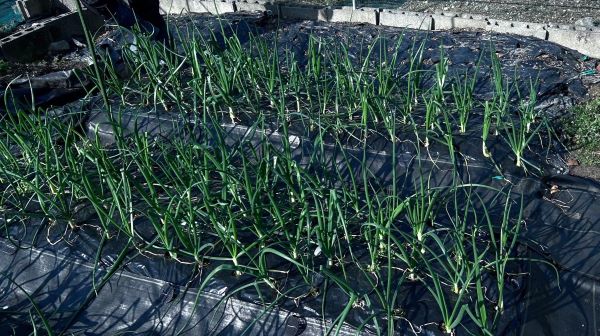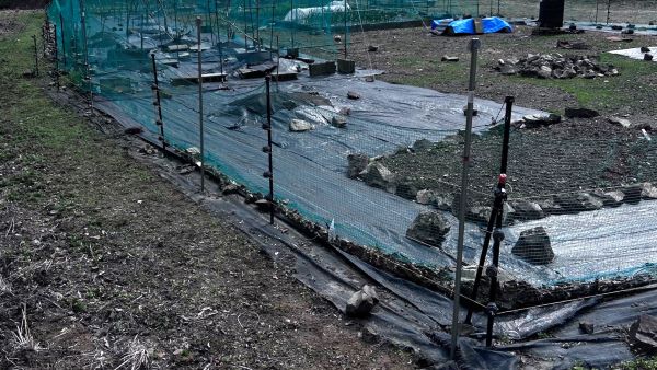 畑の周りの電気柵に沿って敷く防草シートのため、四隅を鉄管に