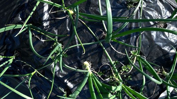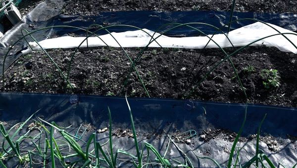 ジャガイモにかぶせてあったマルチがテントを張りだしたので、何か所か