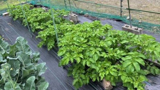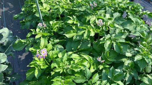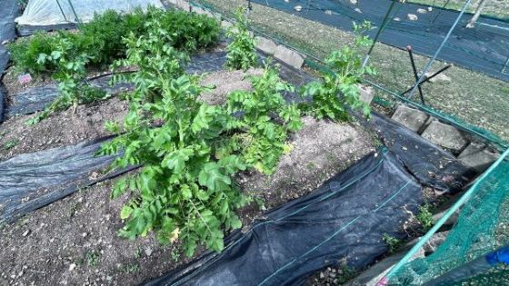 ジャガイモの葉が大変茂っているが、マルチのテントがこれでは