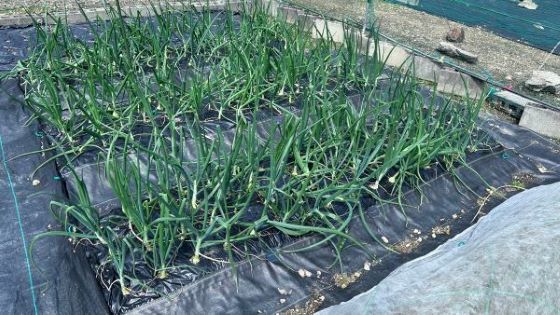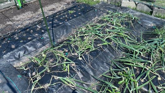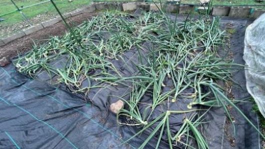 惨烈るタマネギのうち一列70個ほどを収穫した。