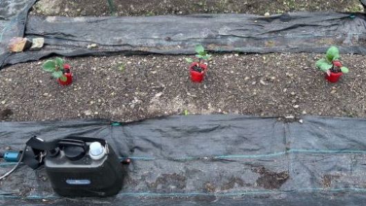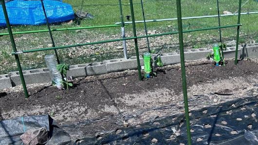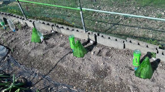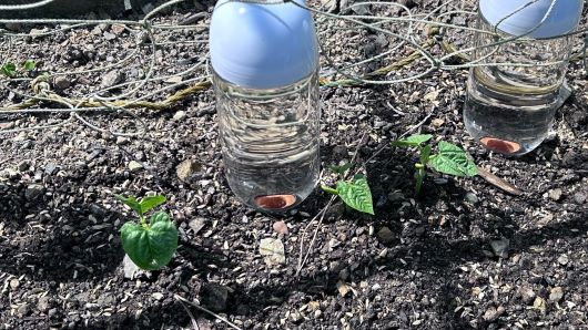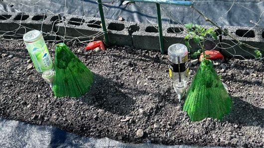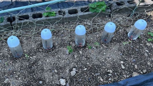 昨日植え付けたスイカとカボチャにインゲンにおいてあった水補給容器を移動させた。