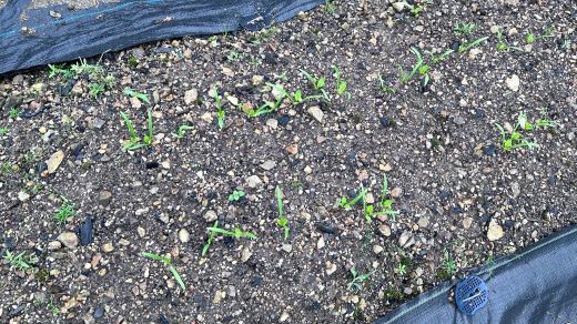 4度目の種まきをしたホウレンソウの細長い芽がたくさん出ていて、どこまで育つか。