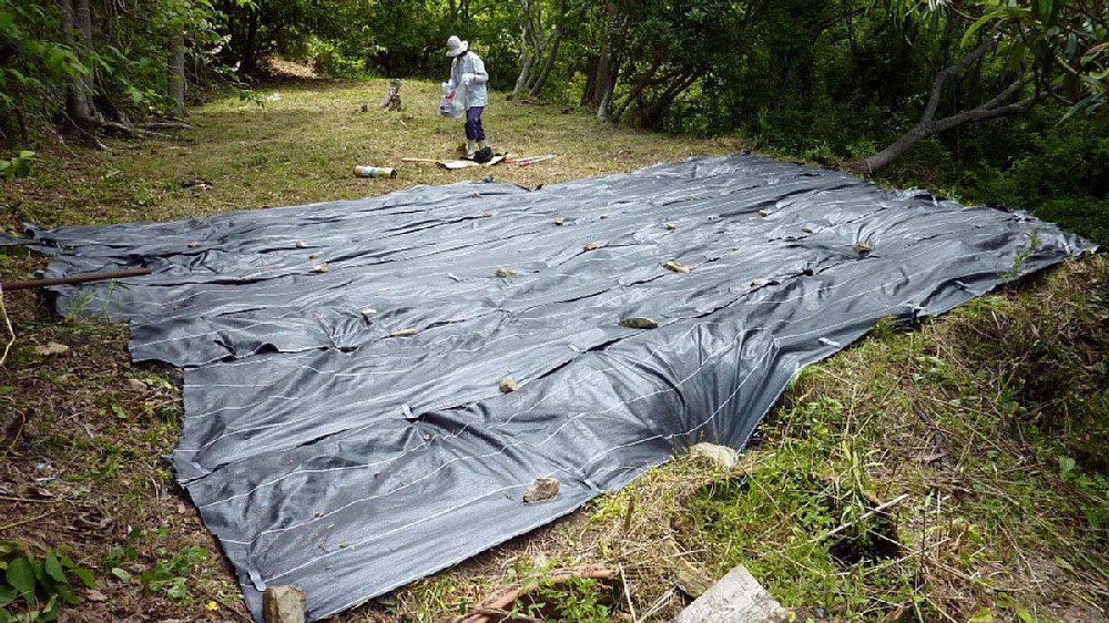 敷いてない部分は背の高さまで雑草が伸びている。順次シートを敷く予定。