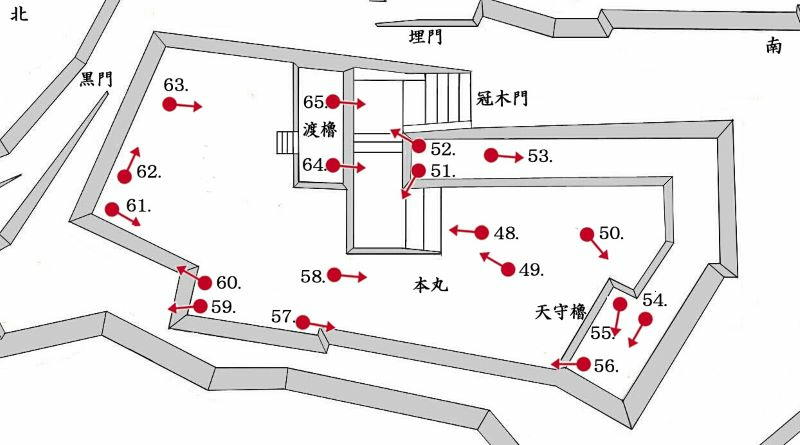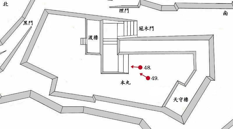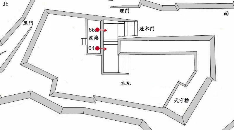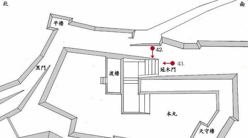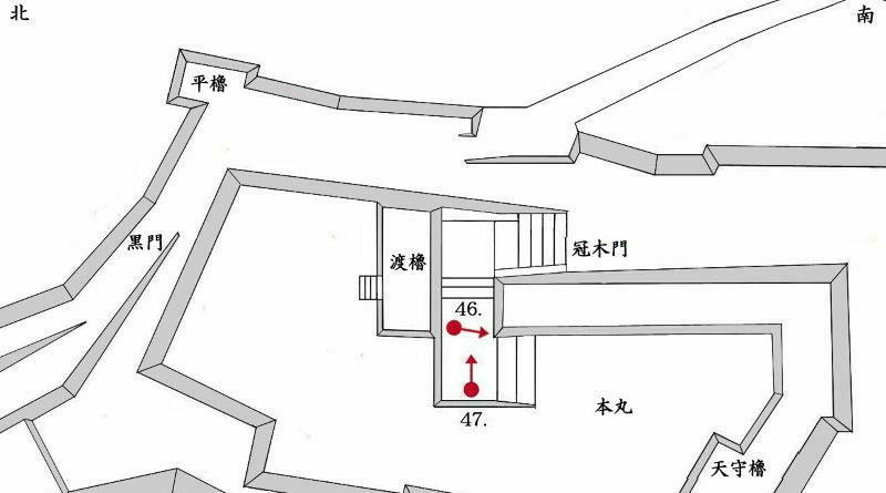 64-3. 本丸渡櫓台からの冠木門跡枡形と高麗門跡。
