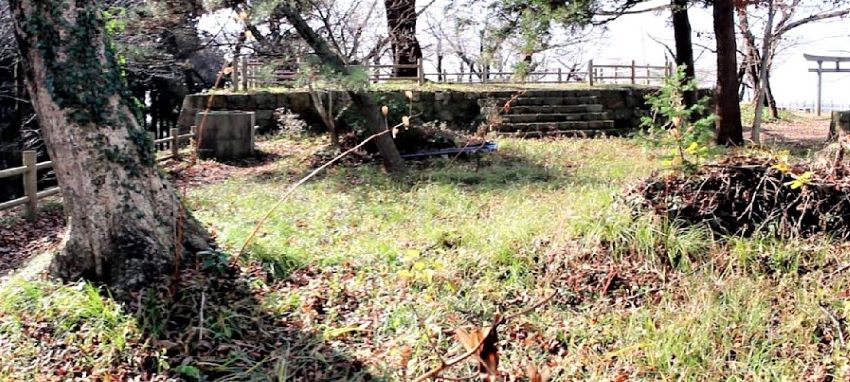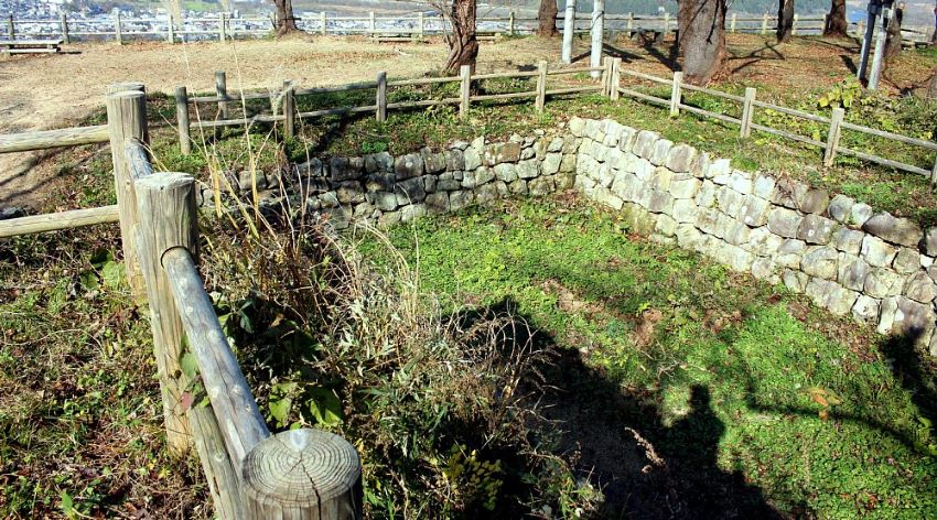 49. 本丸からの冠木門跡枡形と渡櫓台。