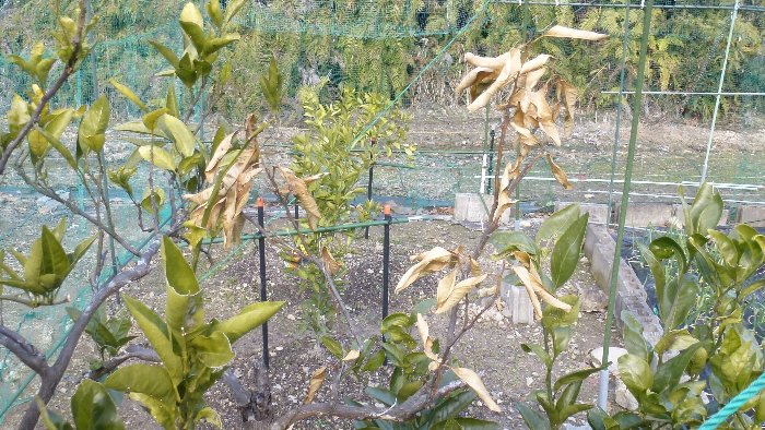 晩生ミカンの青島温州は一部枝と葉が枯れてい弱っている。