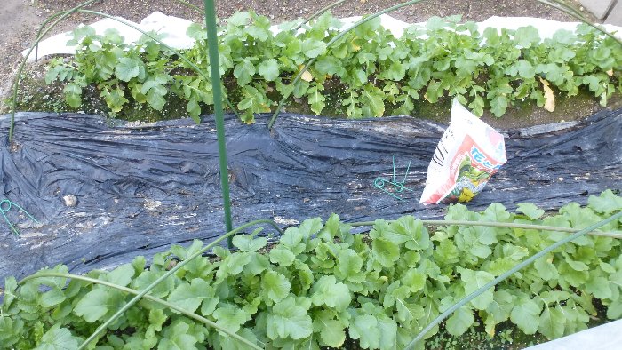 畑の周囲に生える雑草防止のため余っていた防草シートを敷き