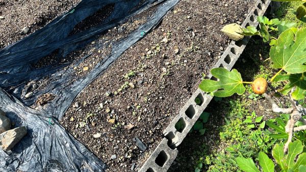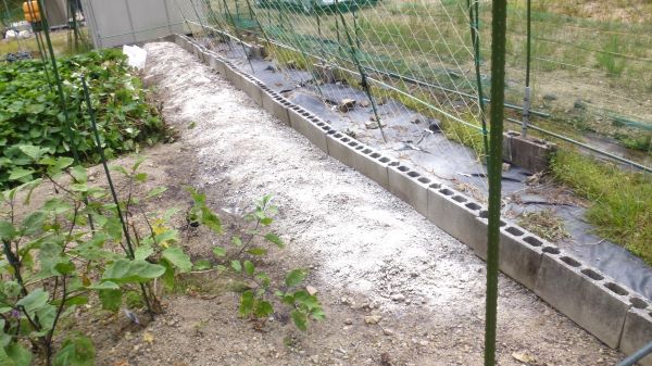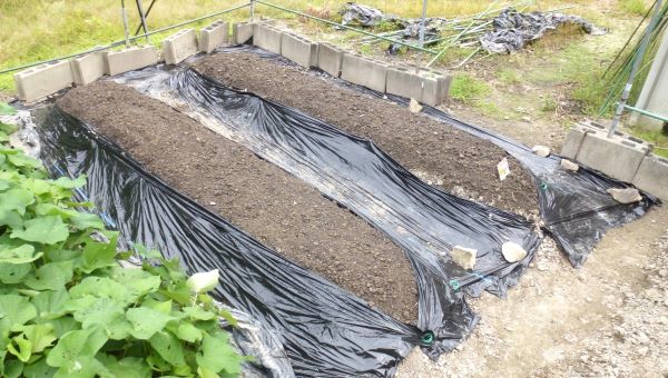 溝には使い古しのマルチを敷き詰め防草対策にした。