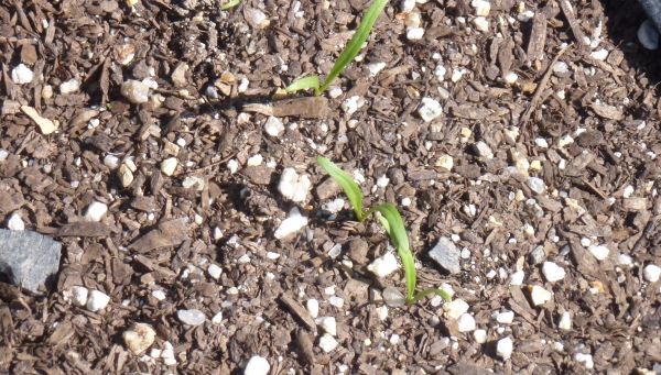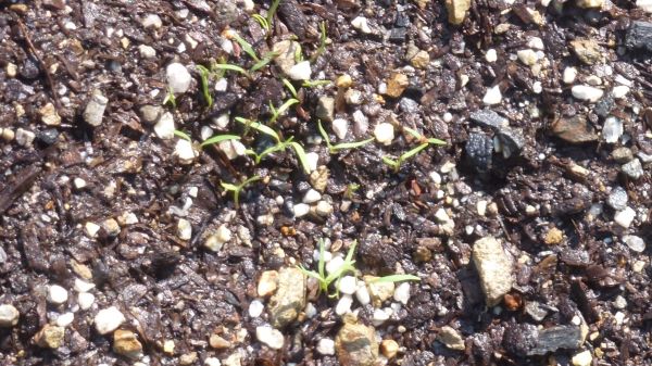 ダイコンの芽が一斉に出たが、ニンジンだけがまだ出ていない。