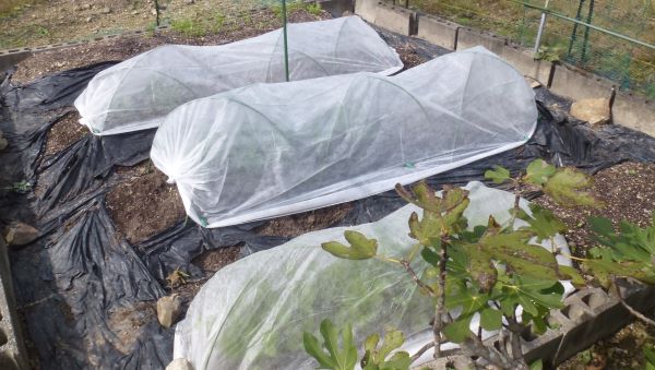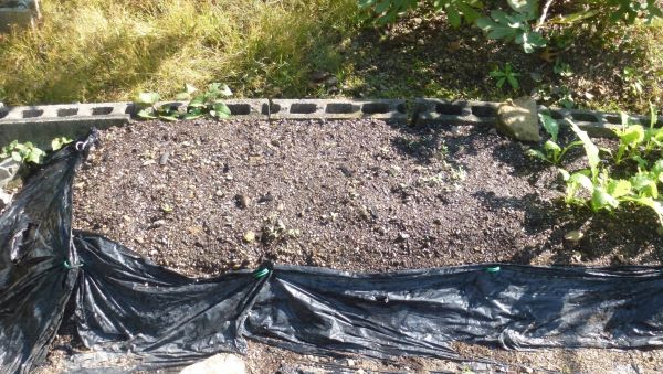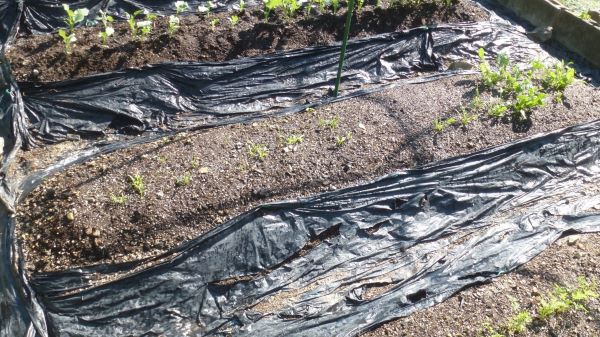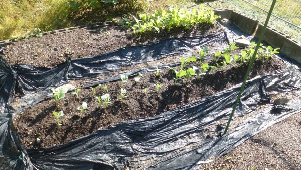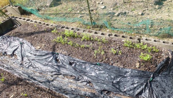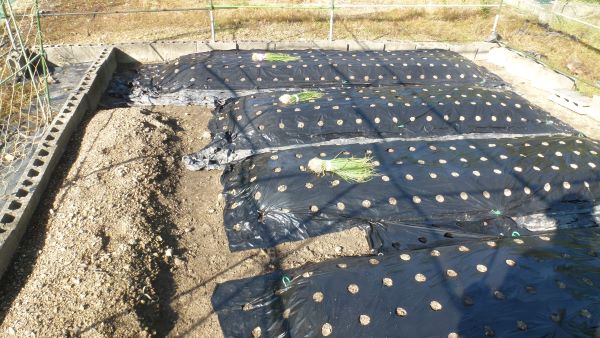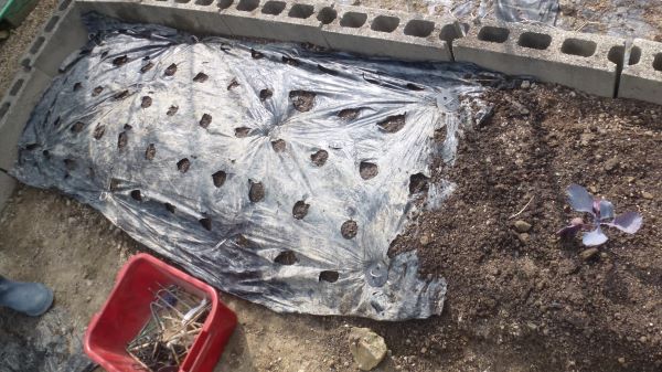 ジャガイモには使い古しのマルチを掛けた。紫キャベツ。