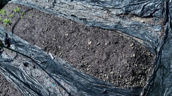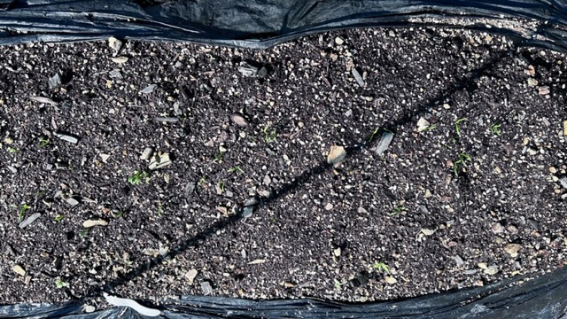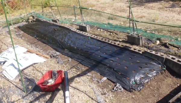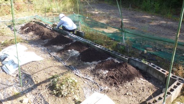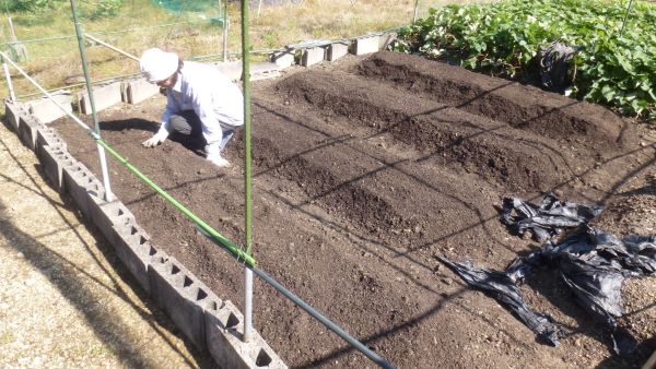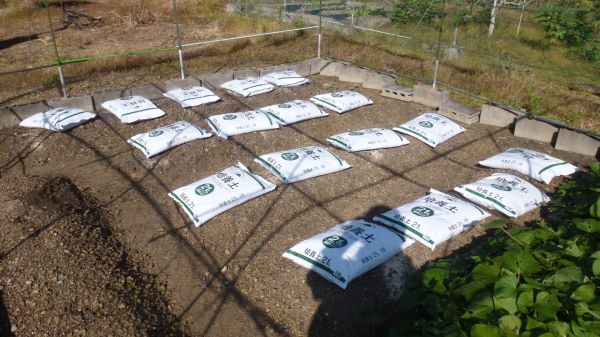 こちらの畑には4畝にタマネギを植えるため、同じ培養土を17袋