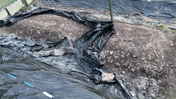 ジャガイモを植付け防寒、防草のために敷いてあったマルチが強風の
