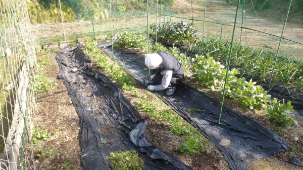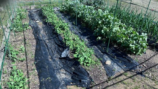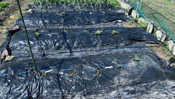ジャガイモに掛けてあるマルチがテントを張り出したので、破って