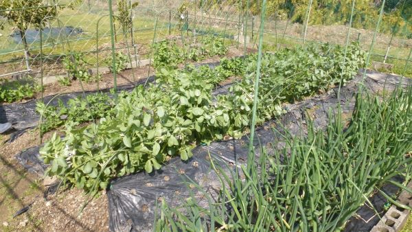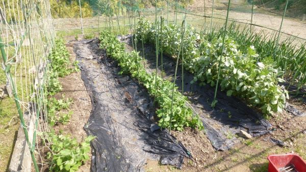 ソラマメ、スナックエンドウが大きくなりだしたので、支えの棒を取り付け害虫対策