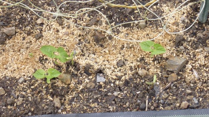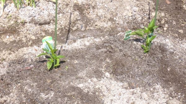 インゲンは12粒植えたがまだ3つ芽が出ているだけ。
