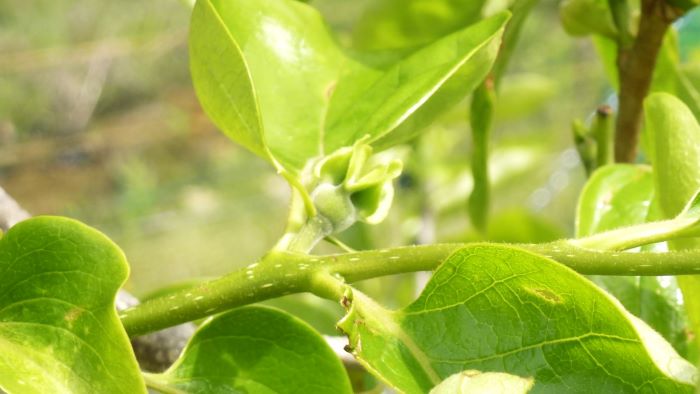 柿の枝と葉のあいだに柿の芽が出てきた。