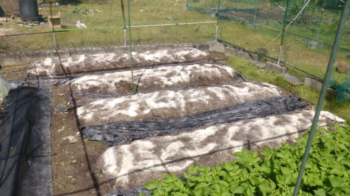 畝に苦土石灰、牛糞を入れてから草苅耕運機でしっかり土を攪拌して