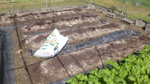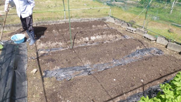 サツマイモとエダマメの準備のためタマネギのあとに苦土石灰と