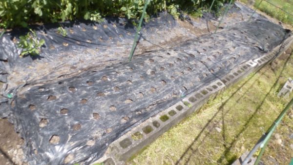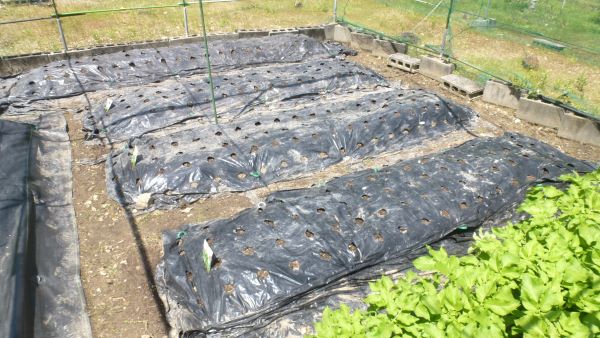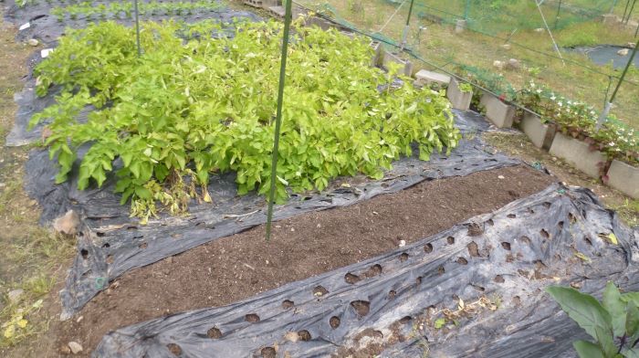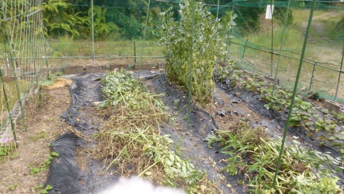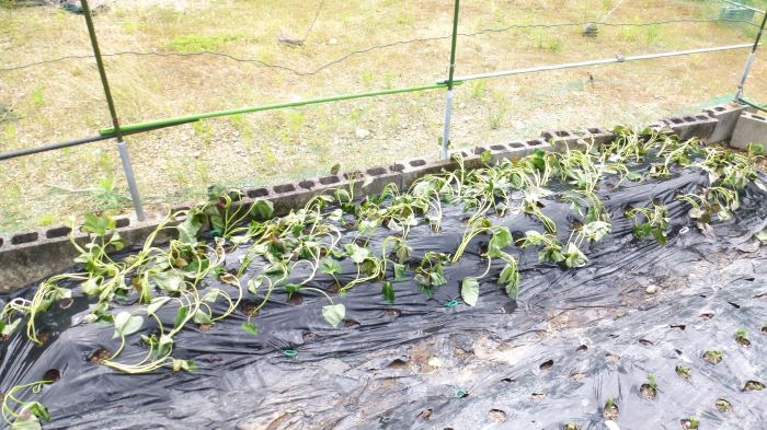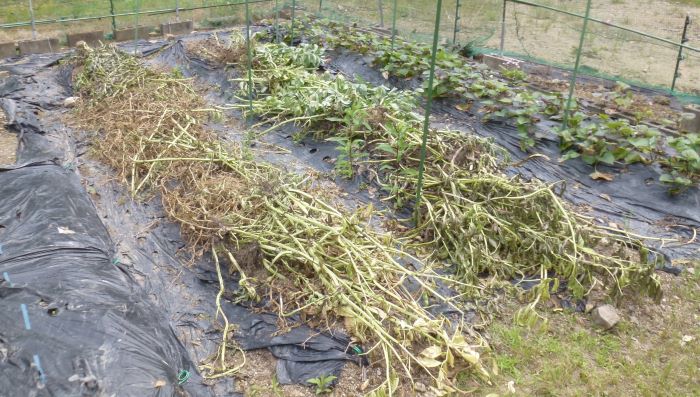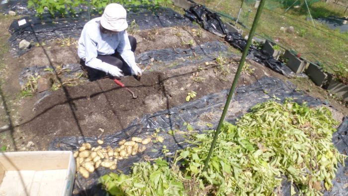 ジャガイモ3畝のうち残りの2畝も葉が黄色くなったため収穫した。マルチを掛けて
