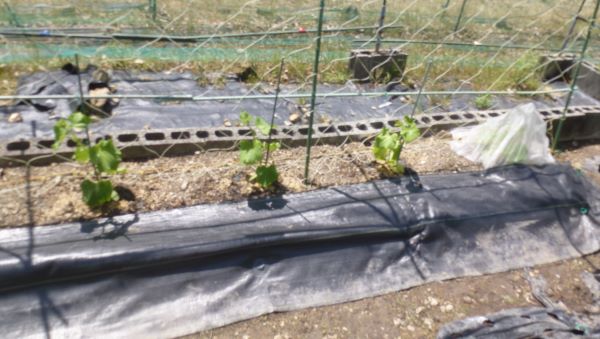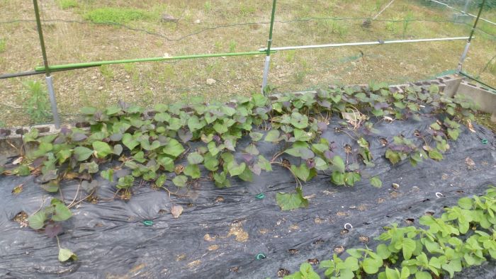 植え付けたサツマイモ(安納芋)の茎に数本立ち上がっているのが早くも見られる。