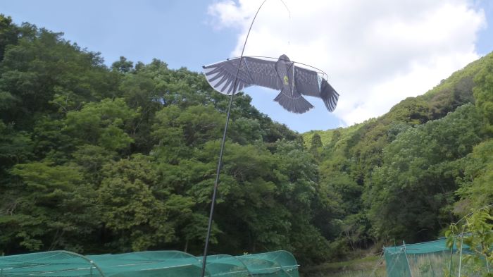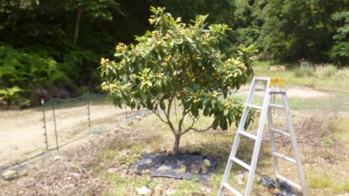 ビワの一部が鳥に突かれていたので、袋かけの予定だったが急遽網掛けをした。