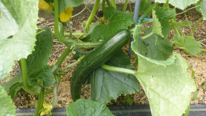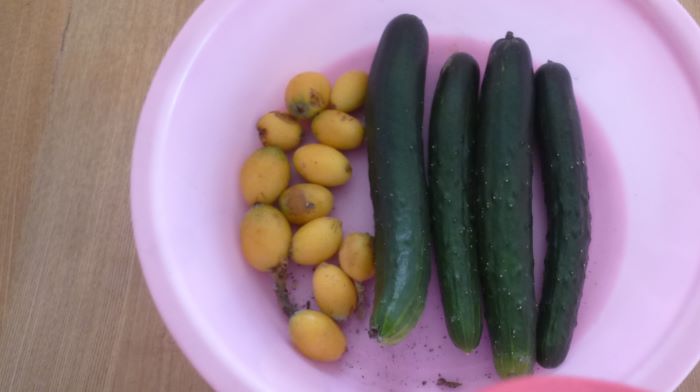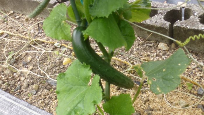 キュウリはまだ小ぶりだが2本初めて収穫した。