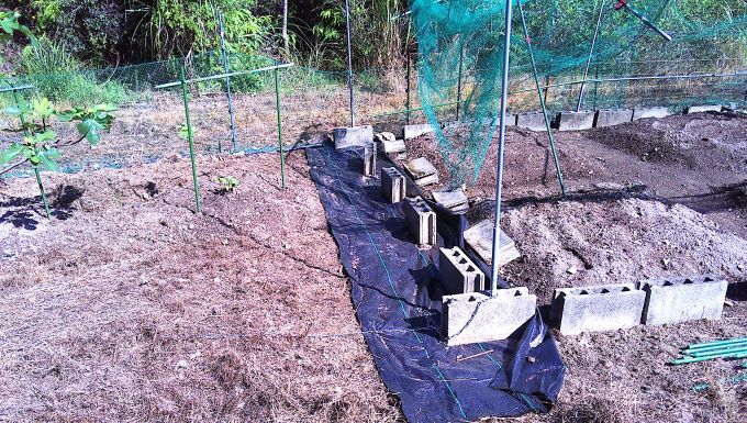 イチジク用畑の西側を左に50センチほど広げ防草シート1メートル幅を敷いた。