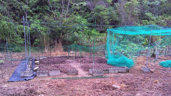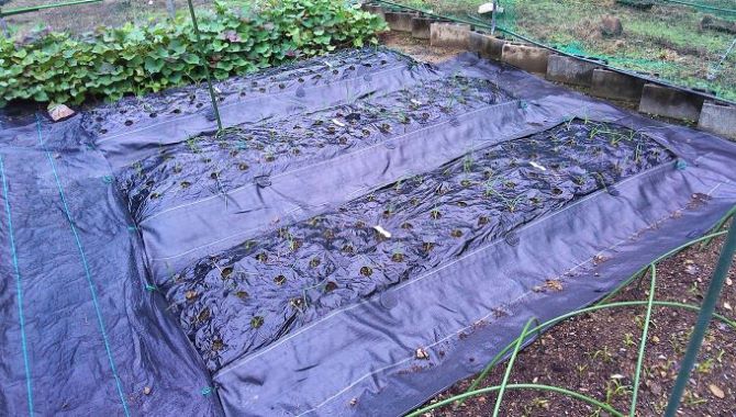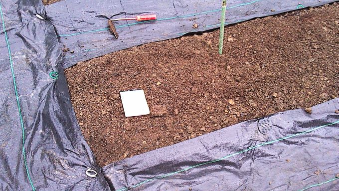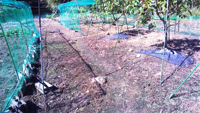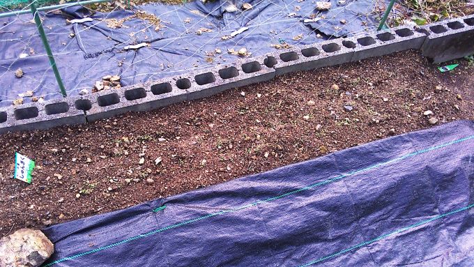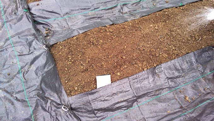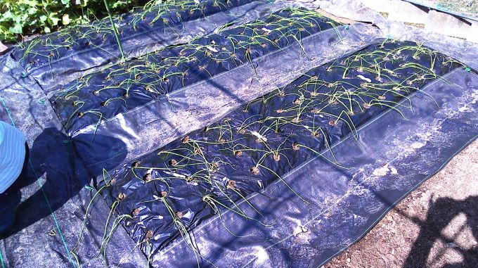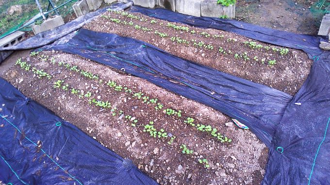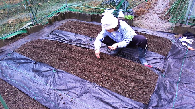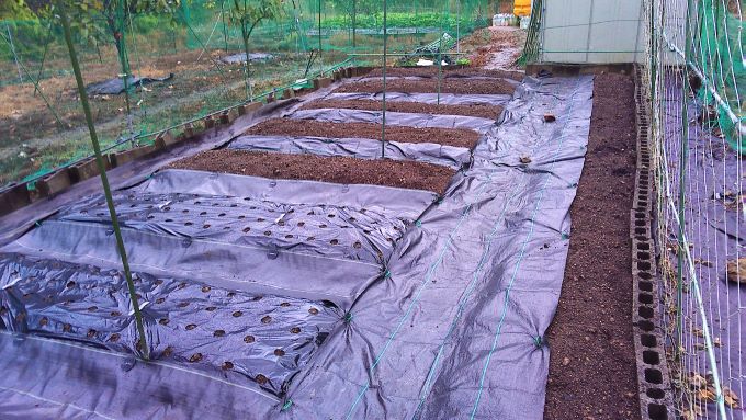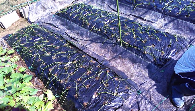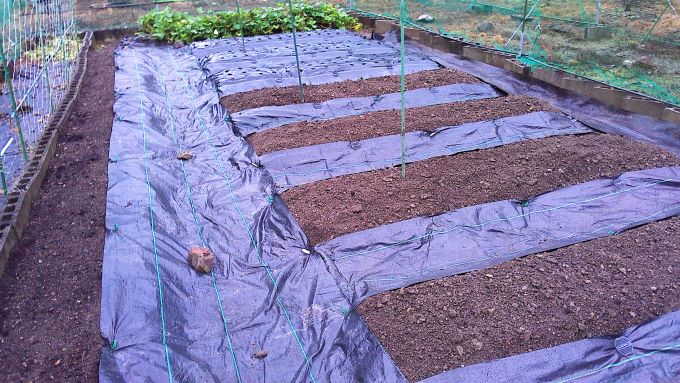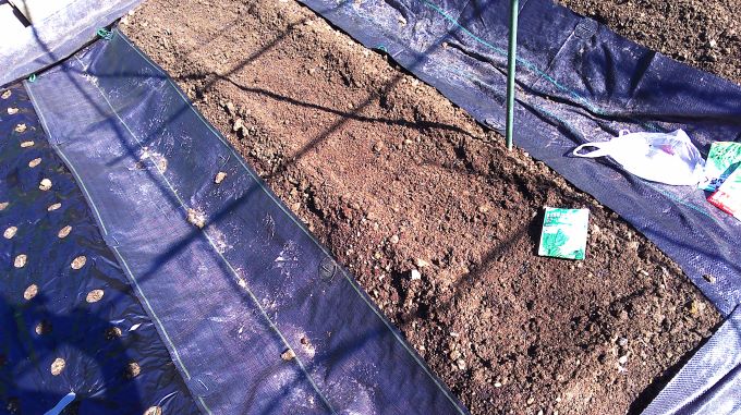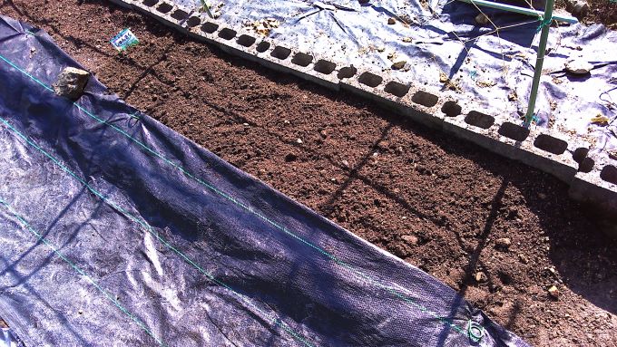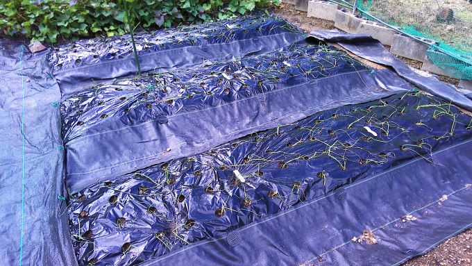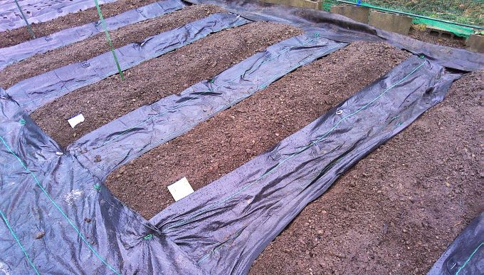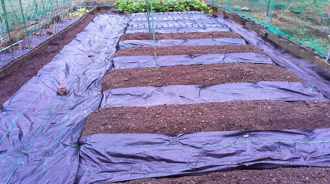タマネギ用の畝に穴あきマルチを、他の冬野菜用の畝には防草シートを敷きつめた。。