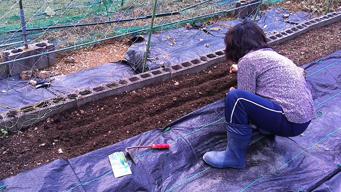ダイコン、カブ、ニンジンの種を蒔いた。