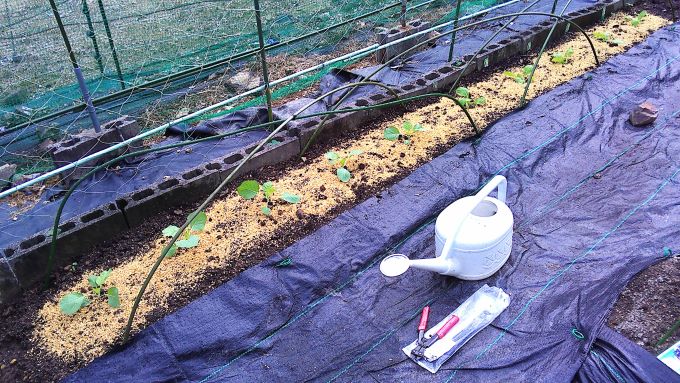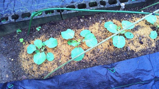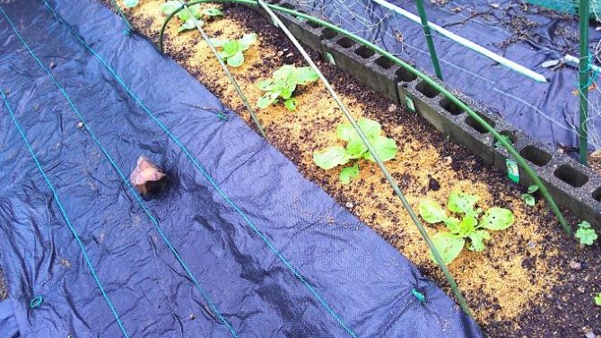 キャベツとハクサイに防虫のモミガラを入れ、不織布用の骨組みを設置。