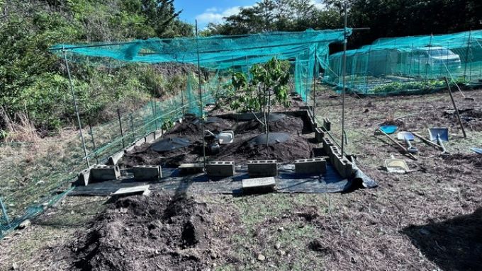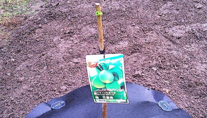 うめ (花香実) の苗を伊勢のバローで購入し、イチジクを移した跡に苦土石灰と牛糞