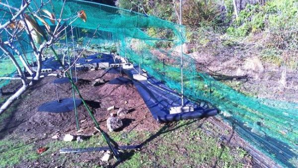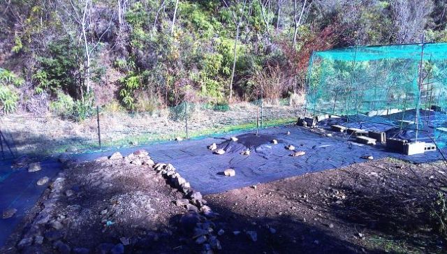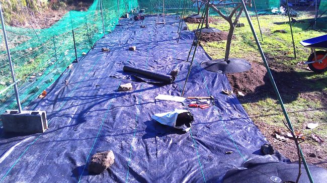 引き続き100mロールの防草シートで柿からイチジクの北側を張った。