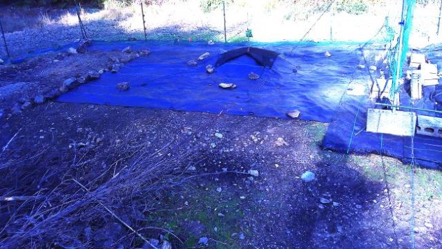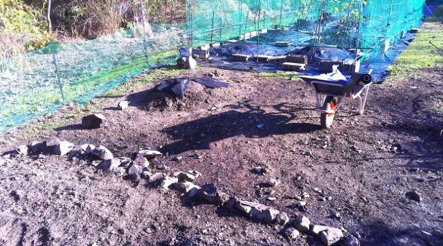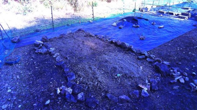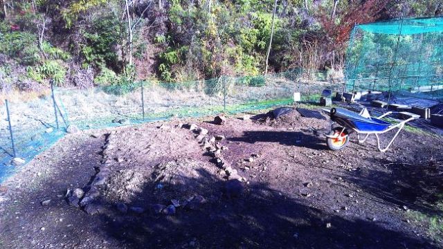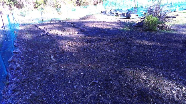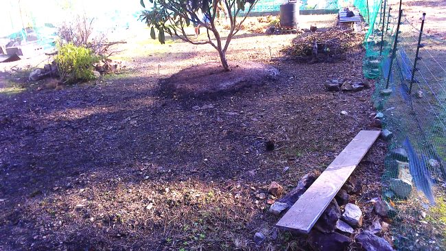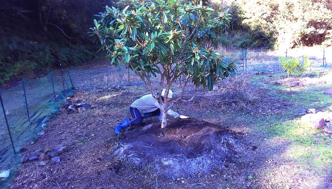 ビワの下も培養土3袋と焼却炉の灰を入れ防草シート張りの準備をした。