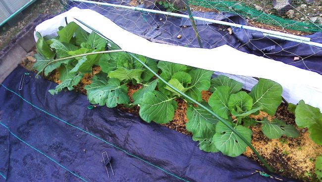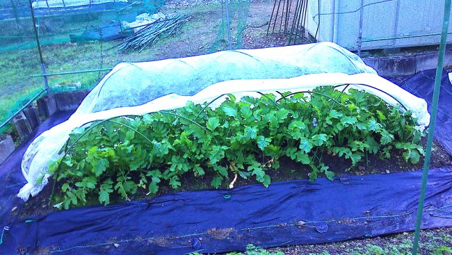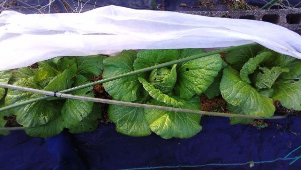 ダイコンとカブの葉が茂り不織布カバーの中が窮屈になってきたため
