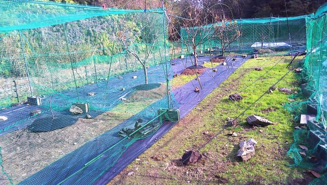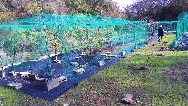 防草シート張りを再開しイチジクの南側から始め、柿の周りへ進めた。