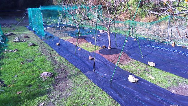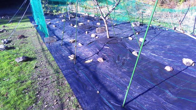 イチジクと柿の周辺を中華temuで購入した1メートル幅のロール防草シーで、